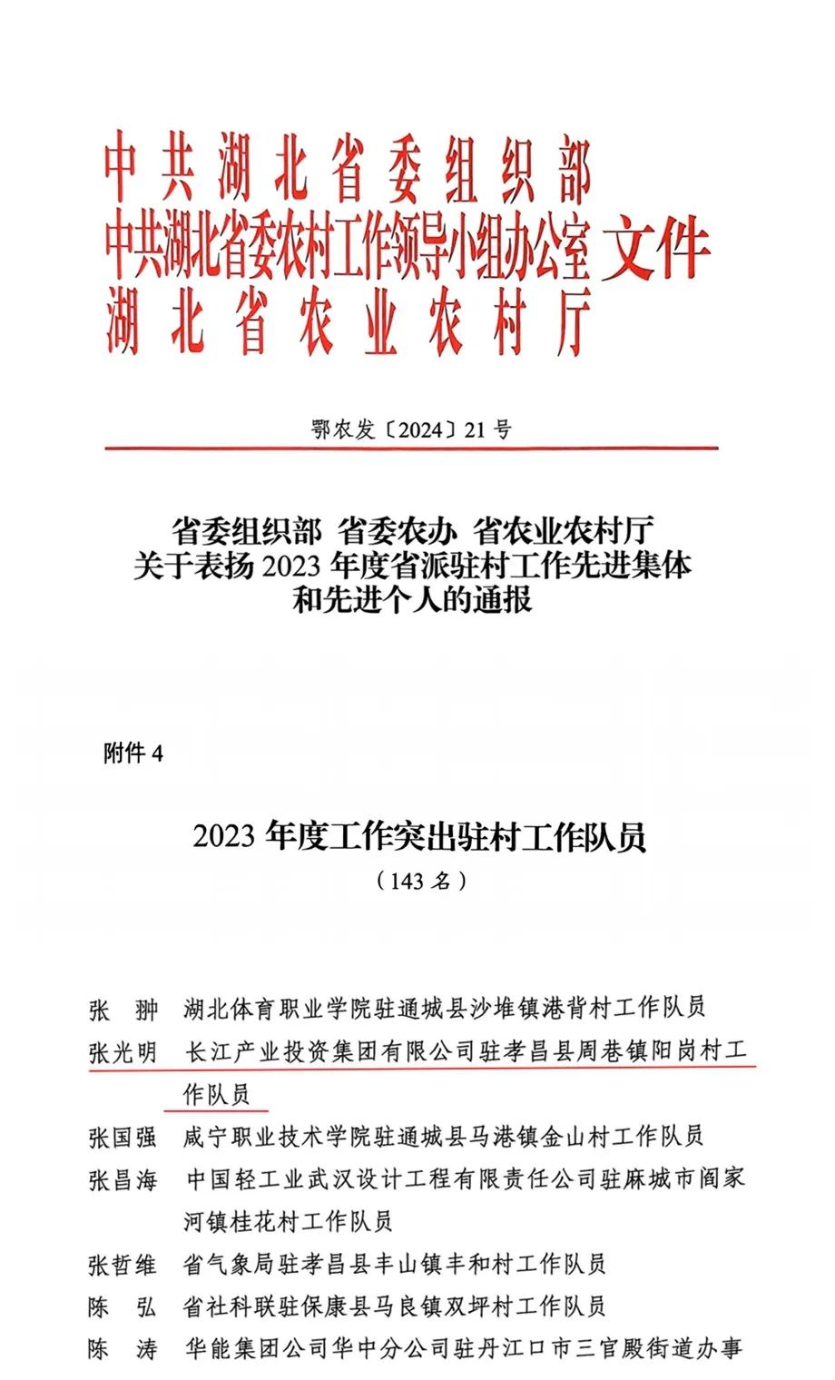 一年多以来,在长江产业集团的坚强领导下,他“吃住在村、岗位在村、工作在村”,发扬不怕吃苦、勇挑重担、一心为民的工作作风,秉承驻村帮扶担使命的职责,厚植强村富民践初心的情怀,深化共同缔造理念,在建强村党组织上下功夫、在推进强村富民上出实招、在提升治理水平上动脑筋、在为民办事服务上用真情,被省委组织部、省委农办、省农业农村厅评为“2023年度工作突出驻村工作队员”。