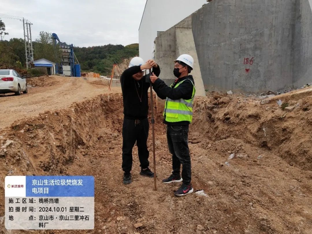 栈桥区域正紧张有序地进行填土段挡墙基础土方开挖施工,为确保地基承载力满足要求,管理人员对地基强度进行检测。确保挡墙施工完成后,不发生超过设计要求的位移和沉降,为项目投运后生活垃圾运输通道奠定基础。