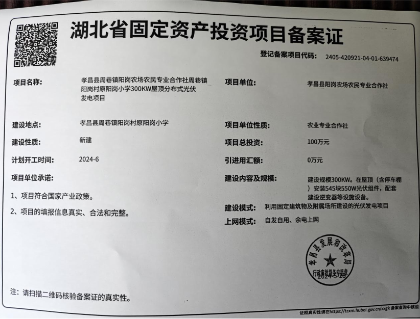 为了增加阳岗村集体收入,驻村工作队通过调研论证,决定建设车棚分布式光伏发电项目。因项目建设地址为原阳岗小学,办理备案证的孝昌县发改局要求提供的项目用地证明材料需要县教育局的同意,他多次到县发改局、县教育局和周巷镇人民政府等部门协调,于5月28日获取孝昌县发改局颁发的《湖北省固定资产投资项目备案证》。因光伏发电项目附近的变压器功率较小,并网发电需要更换变压器。他与村干部一起,多次到孝昌县供电公司和周巷镇供电所请求支持,最终以最小的成本更换满足上网的变压器,并于10月28日成功并网发电。该项目年发电量约18万度,增加村集体收入近8万元,“照亮”乡村振兴绿色发展之路,成为阳岗村巩固拓展脱贫攻坚成果同乡村全面振兴有效衔接的重要支撑。