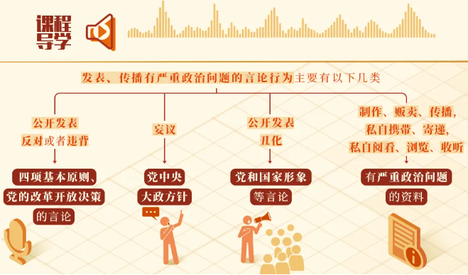 制作、贩卖、传播有严重政治问题的报刊、书籍、音像制品、电子读物,以及网络文本、图片、音频、视频资料等,无论是否有牟利目的,都属于违纪行为。