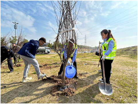 植树现场,志愿者们热情高涨、干劲十足,运树苗、填土、运水、浇水、给小树“松绑”这一系列工序,大家分工协作、配合默契,一派热火朝天的劳动景象。