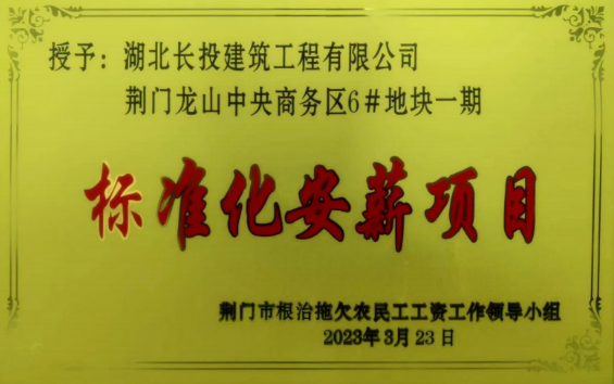 7月13日,长江投开下属长投建工承建的荆门龙山中央商务区6#地块一期项目荣获荆门市2023年“标准化安薪项目”。