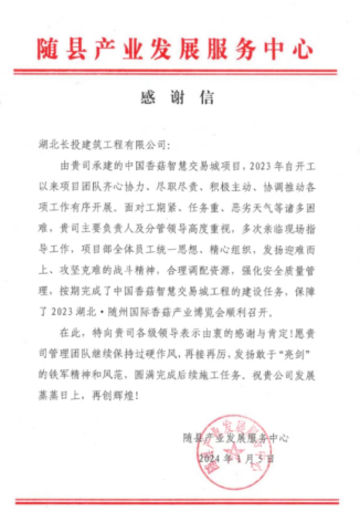 荣誉丨长投建工收到来自随县发展中心的感谢信