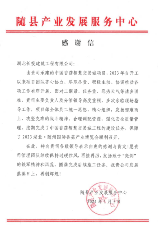 近日,长江投开下属长投建工收到来自随县发展服务中心的感谢信。对其按期高效完成中国香菇智慧交易城工程建设任务,保障2023年湖北·随州国际香菇产业博览会顺利召开表示了由衷的感谢和肯定。