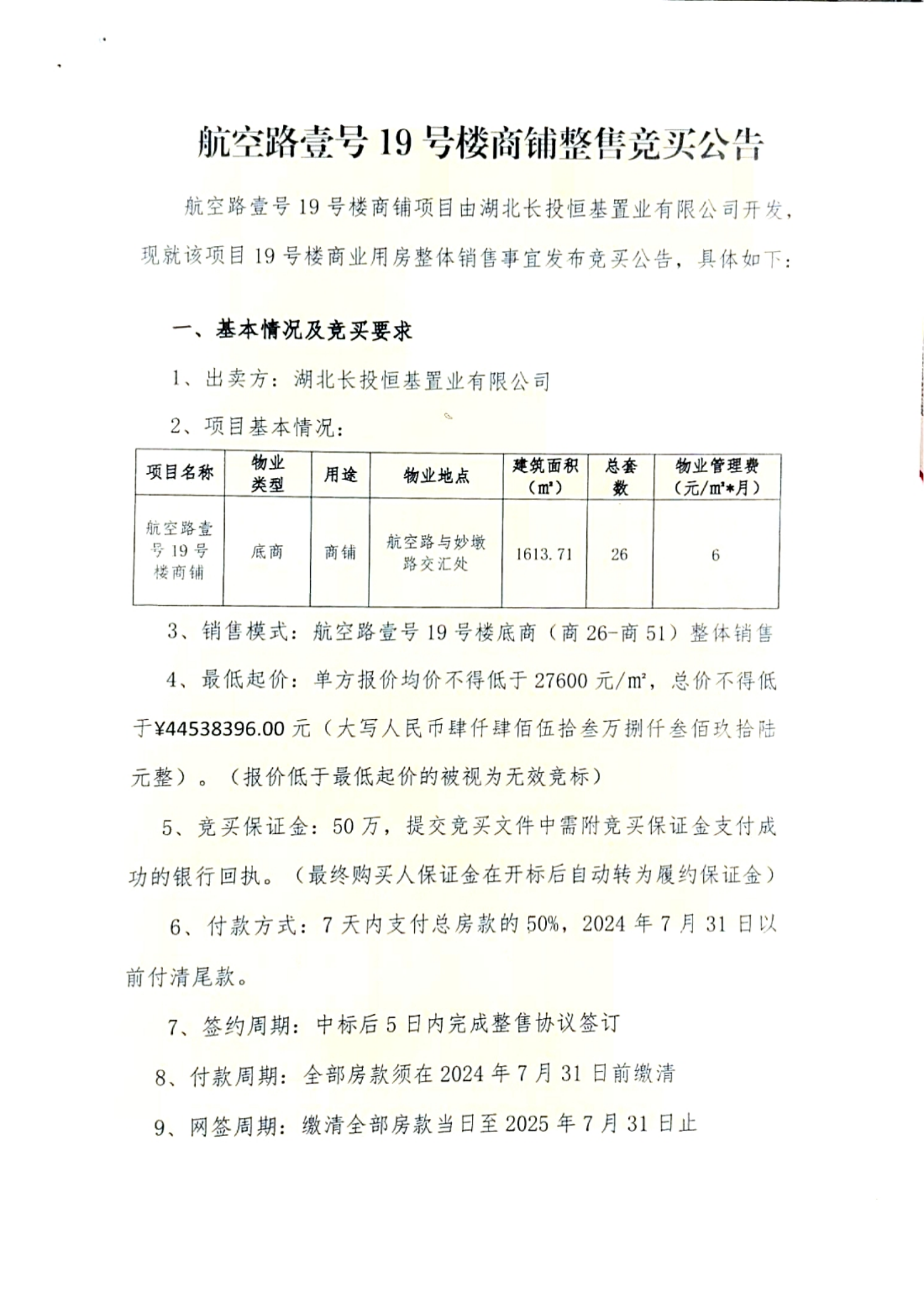 航空路壹号19号楼商铺整售竞买公告